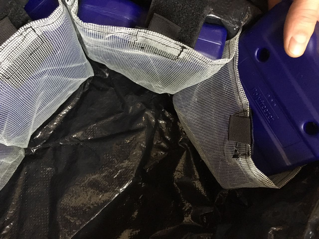Bolso de mano confeccionado en tela aislante e interior impermeable. Con bolsillos de red para 6 refrigerantes rígidos Polyfreezer® y cierre abrojo.